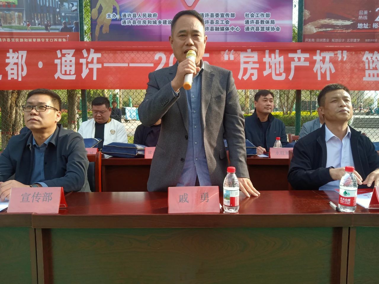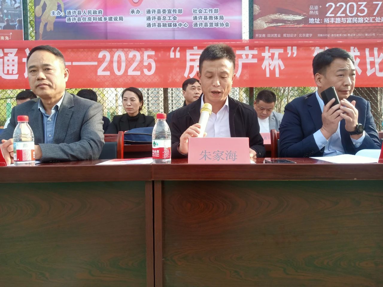 開(kāi)封市住房和城鄉(xiāng)建設(shè)局黨組成員、副局長(zhǎng)戚勇宣布通許縣首屆中國(guó)酸辣粉之都·通許—2025 “房地產(chǎn)杯”籃球賽開(kāi)幕。