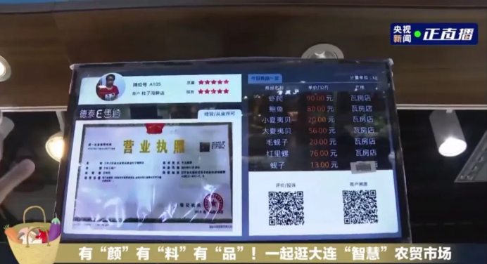 每個(gè)商戶(hù)的招牌下面都有一個(gè)屏幕,顯示著經(jīng)營(yíng)業(yè)戶(hù)的營(yíng)業(yè)執(zhí)照、食品類(lèi)別、食品價(jià)格包括它的產(chǎn)地,一目了然,保證食品的品質(zhì)和安全。
