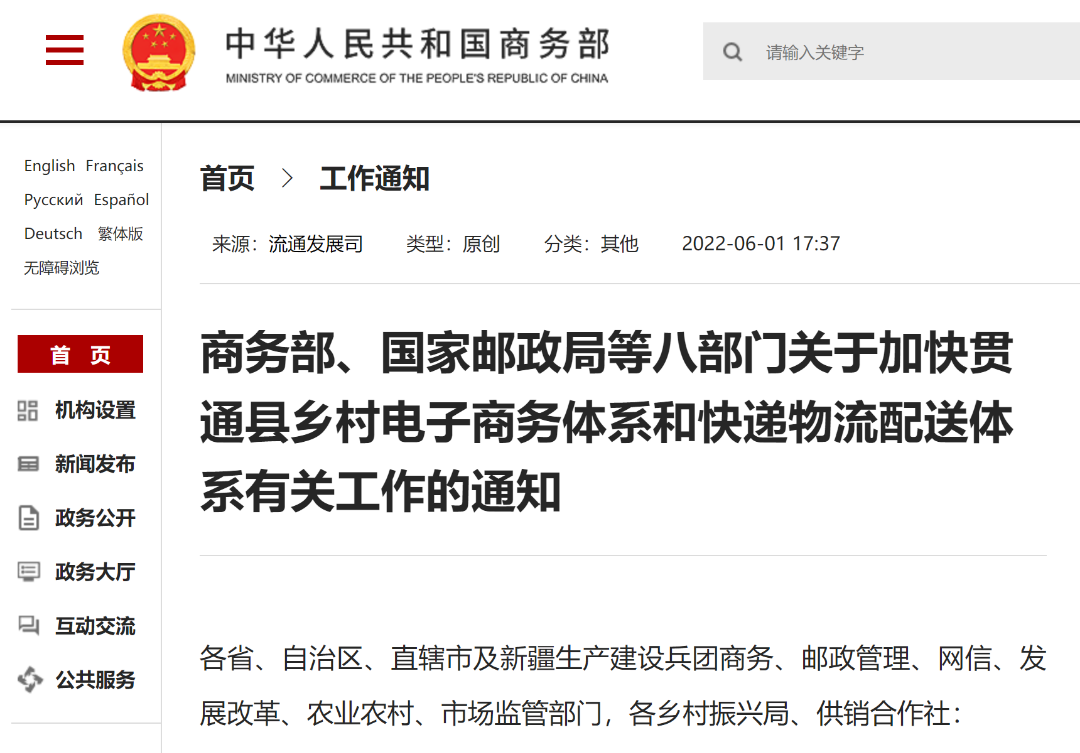發(fā)展農(nóng)村電子商務(wù)和快遞物流配送是促進(jìn)城鄉(xiāng)生產(chǎn)和消費(fèi)有效銜接的重要舉措,是全面推進(jìn)鄉(xiāng)村振興、構(gòu)建新發(fā)展格局的客觀要求。為認(rèn)真貫徹落實(shí)黨中央、國(guó)務(wù)院決策部署,深入推進(jìn)電子商務(wù)與快遞物流配送協(xié)同發(fā)展,加快貫通縣鄉(xiāng)村電子商務(wù)體系和快遞物流配送體系,現(xiàn)就有關(guān)工作通知如下。