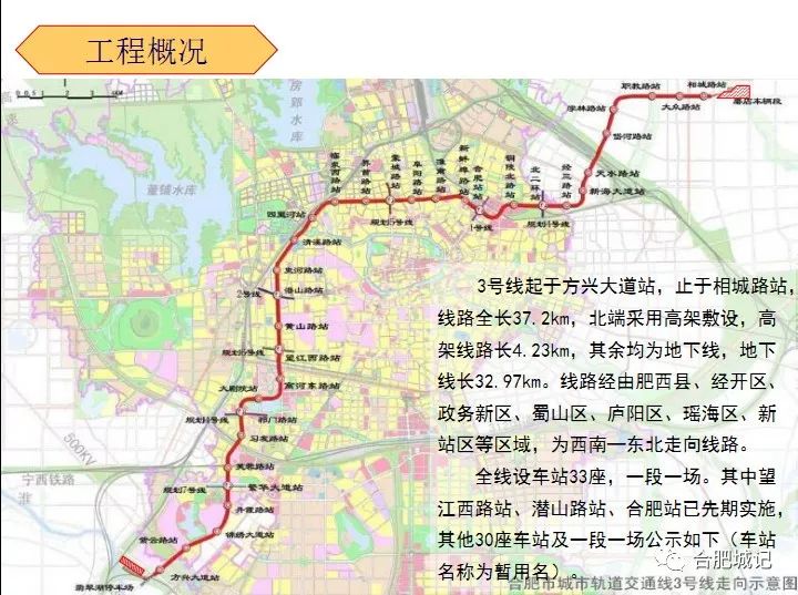 沿線站點為33個,線路起于方興大道站,止于相城路站,線路經(jīng)由肥西縣、蜀山區(qū)、廬陽區(qū)、瑤海區(qū),為西南東北走向線路。全長37.2公里,北端采用高架敷設(shè),高架線路長4.23公里,其余均為地下線,地下線長32.97公里,平均站間距為1.15km。