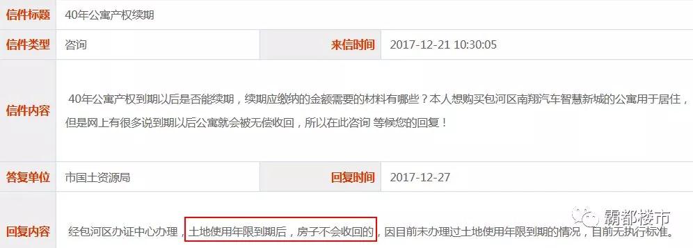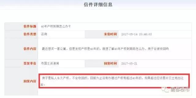 今天,在合肥12345上,合肥市國土資源局回復有關“40年公寓產(chǎn)權到期”的問題,表示:產(chǎn)權到期,房子不會收回。